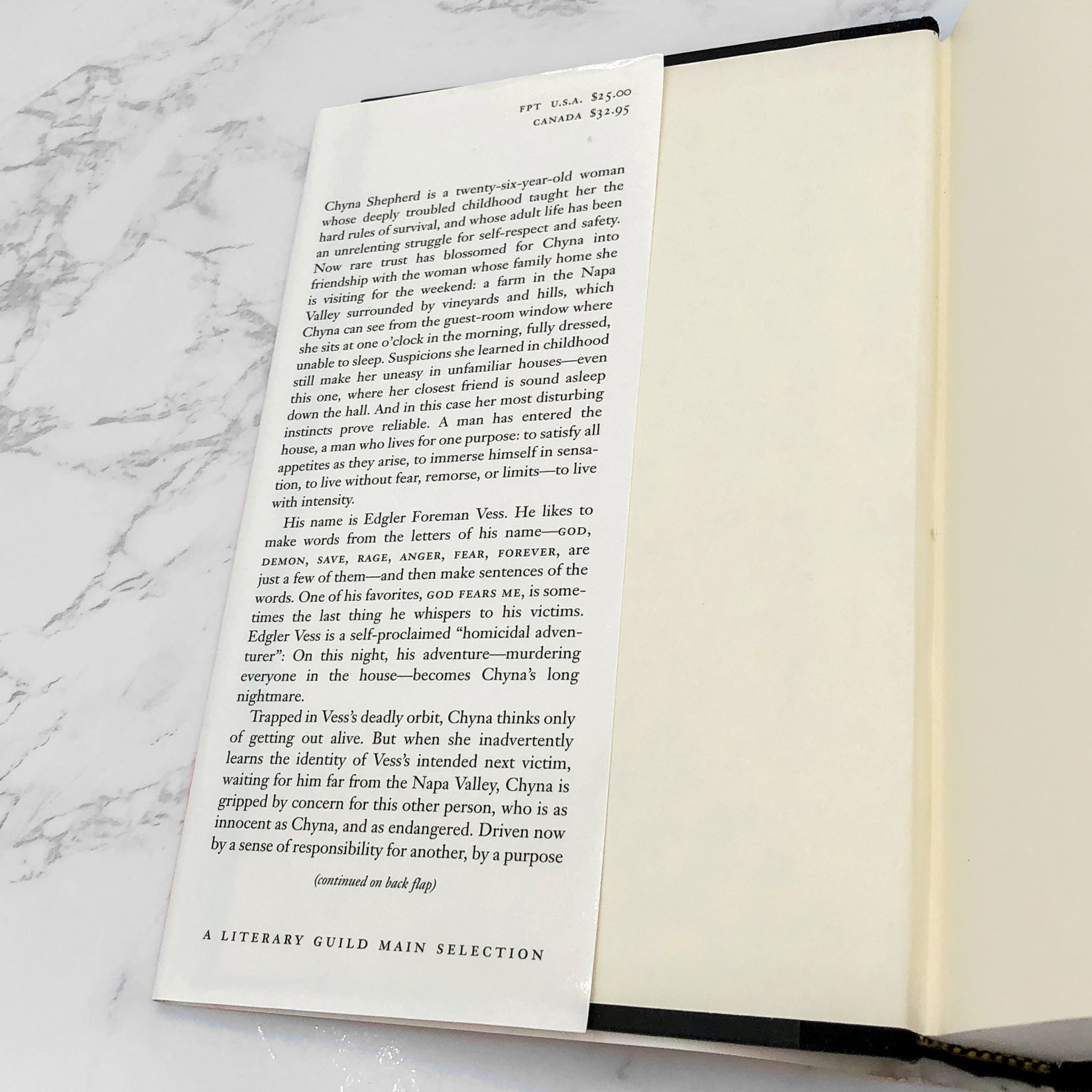 Past midnight, Chyna Shepard, twenty-six, gazes out a moonlit window, unable to sleep on her first night in the Napa Valley home of her best friend's family. Instinct proves reliable. A murderous sociopath, Edgler Foreman Vess, has entered the house, intent on killing everyone inside. A self-proclaimed "homicidal adventurer," Vess lives only to satisfy all appetites as they arise, to immerse himself in sensation, to live without fear, remorse or limits, to live with "intensity." Chyna is trapped in his deadly orbit.
