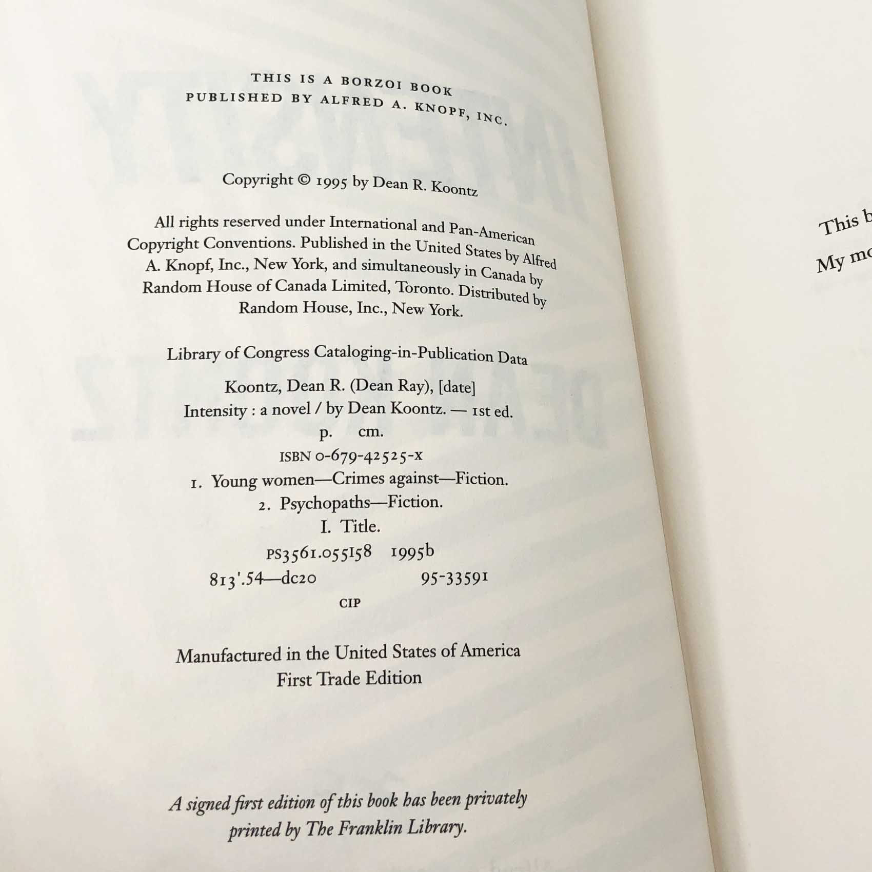 Intensity by Dean Koontz [FIRST EDITION • FIRST PRINTING] 1995 • Knopf