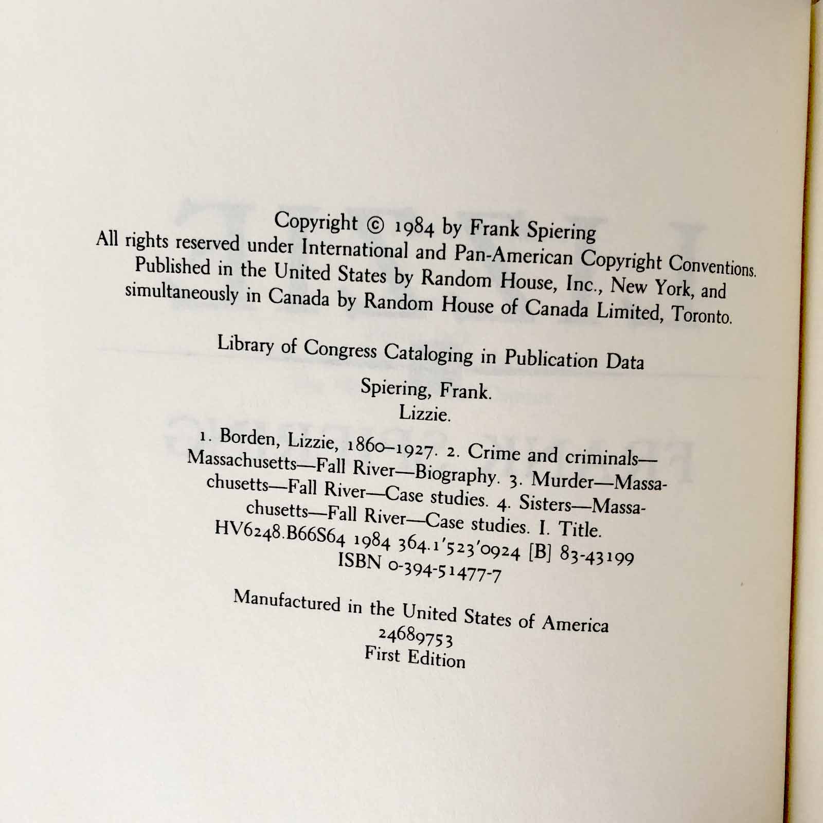 Lizzie: The Story of Lizzie Borden by Frank Spiering [FIRST EDITION] 1984