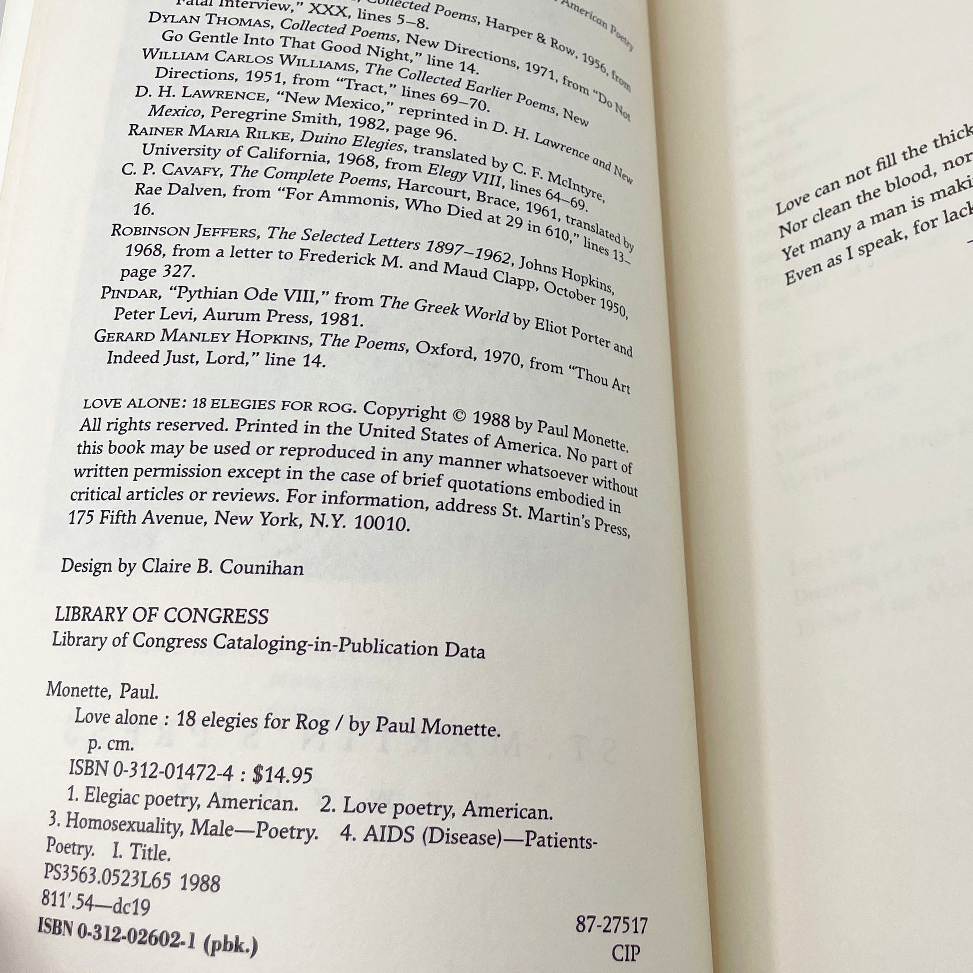 An eighteen-poem cycle on the death of his lover from AIDS emphasizes the power of love and its survival through pain and anger, and the tragedy and magnitude of a terrifying twist of fate and its effect on a generation