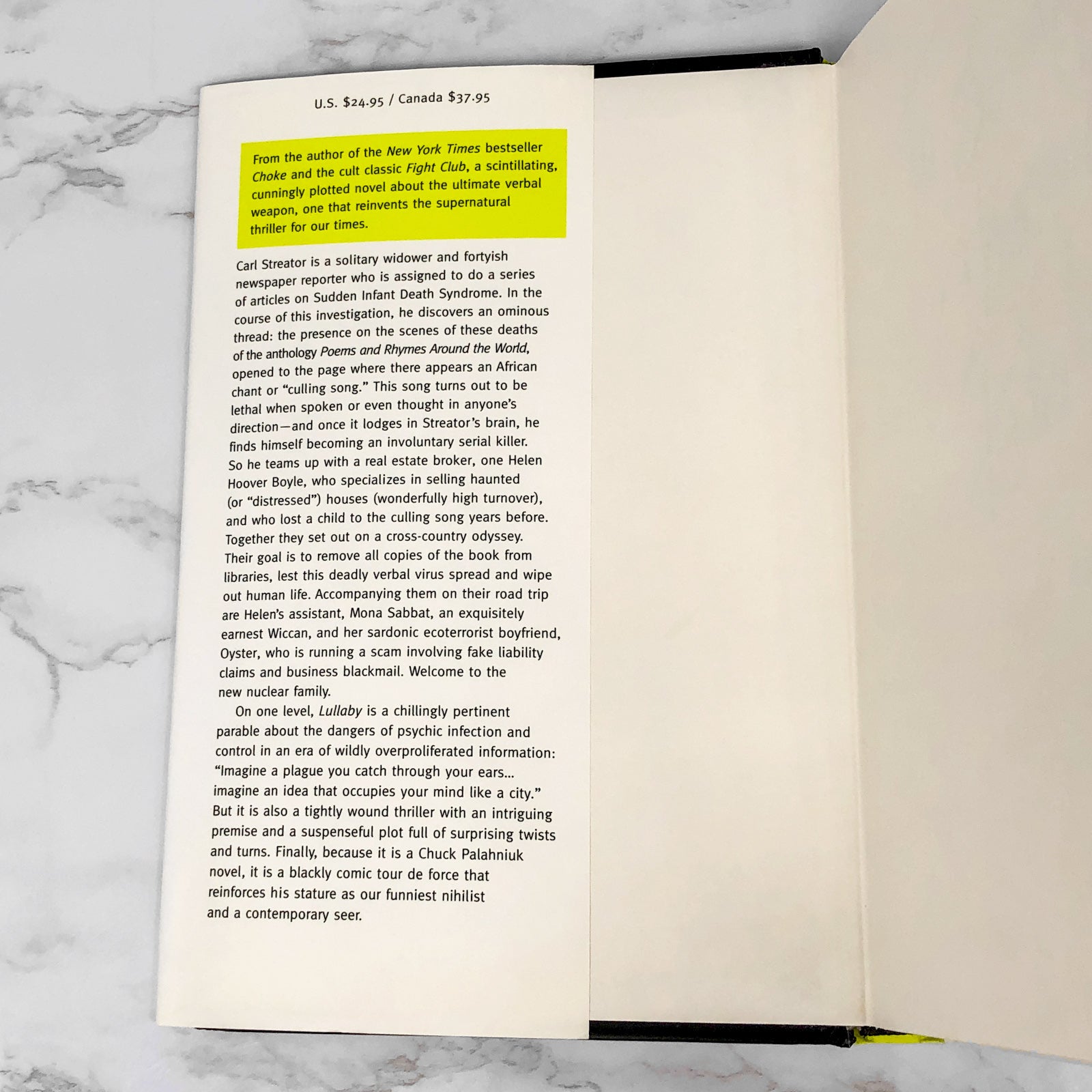 Carl Streator is a reporter investigating Sudden Infant Death Syndrome for a soft-news feature. After responding to several calls with paramedics, he notices that all the dead children were read the same poem from the same library book the night before they died. It's a 'culling song' - an ancient African spell for euthanising sick or old people. Researching it, he meets a woman who killed her own child with it accidentally. He himself accidentally killed his own wife and child with the same poem twenty years earlier. Together, the man and the woman must find and destroy all copies of this book, and try not to kill every rude sonofabitch that gets in their way. Lullaby is a comedy/drama/tragedy. In that order. It may also be Chuck Palahniuk's best book yet.