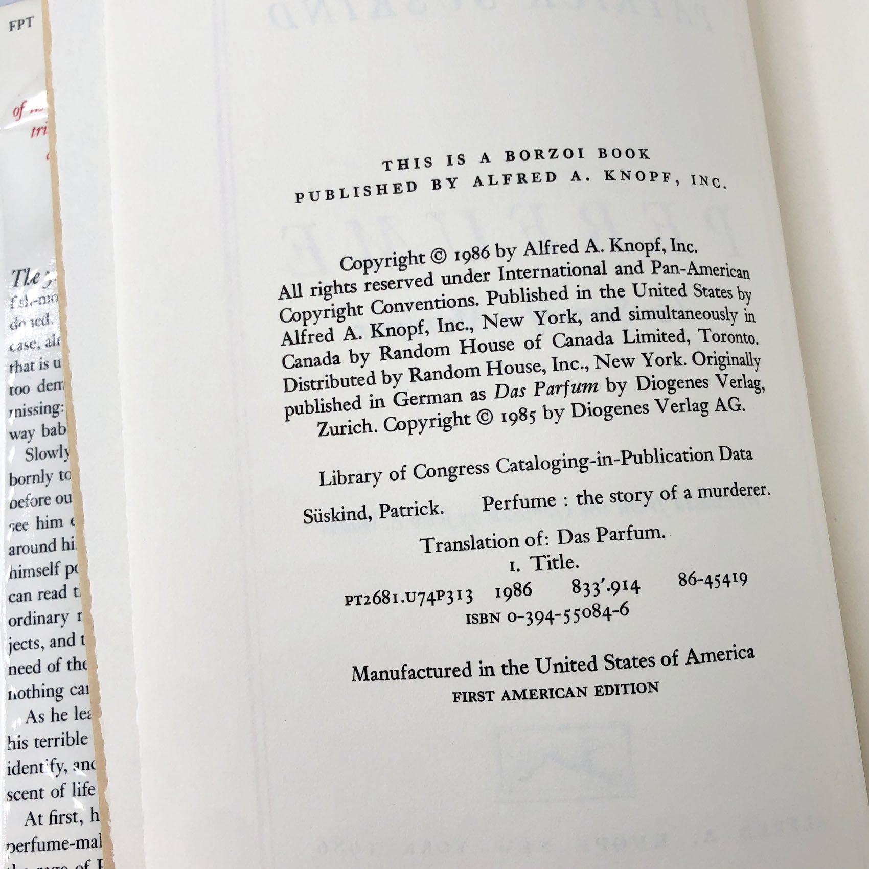 Perfume: The Story of a Murderer by Patrick Süskind [FIRST EDITION • FIRST PRINTING] 1986 • Knopf