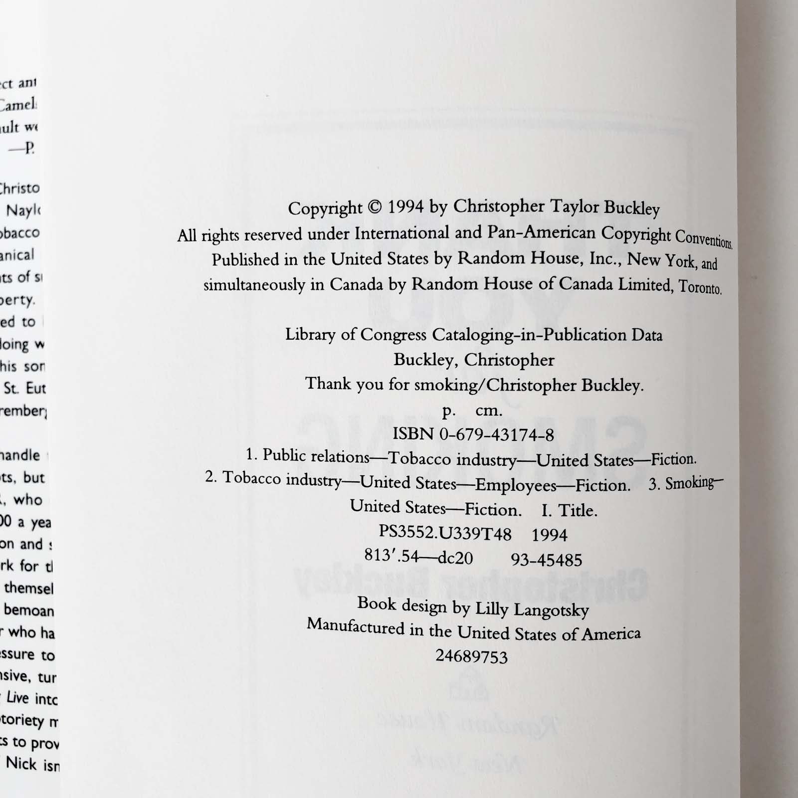 ![Thank You for Smoking by Christopher Buckley [FIRST EDITION] 1994 • Random House](http://bookshopapocalypse.com/cdn/shop/products/thankyouforsmoking-8.jpg?v=1635389612&width=1445)