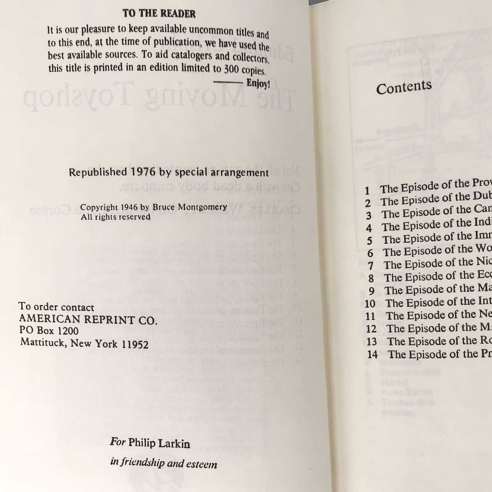 ![The Moving Toyshop by Edmund Crispin [1976 HARDCOVER] 1/300 ❧ The American Reprint Company](http://bookshopapocalypse.com/cdn/shop/products/Movingtoyshop-6.jpg?v=1645506100&width=1445)