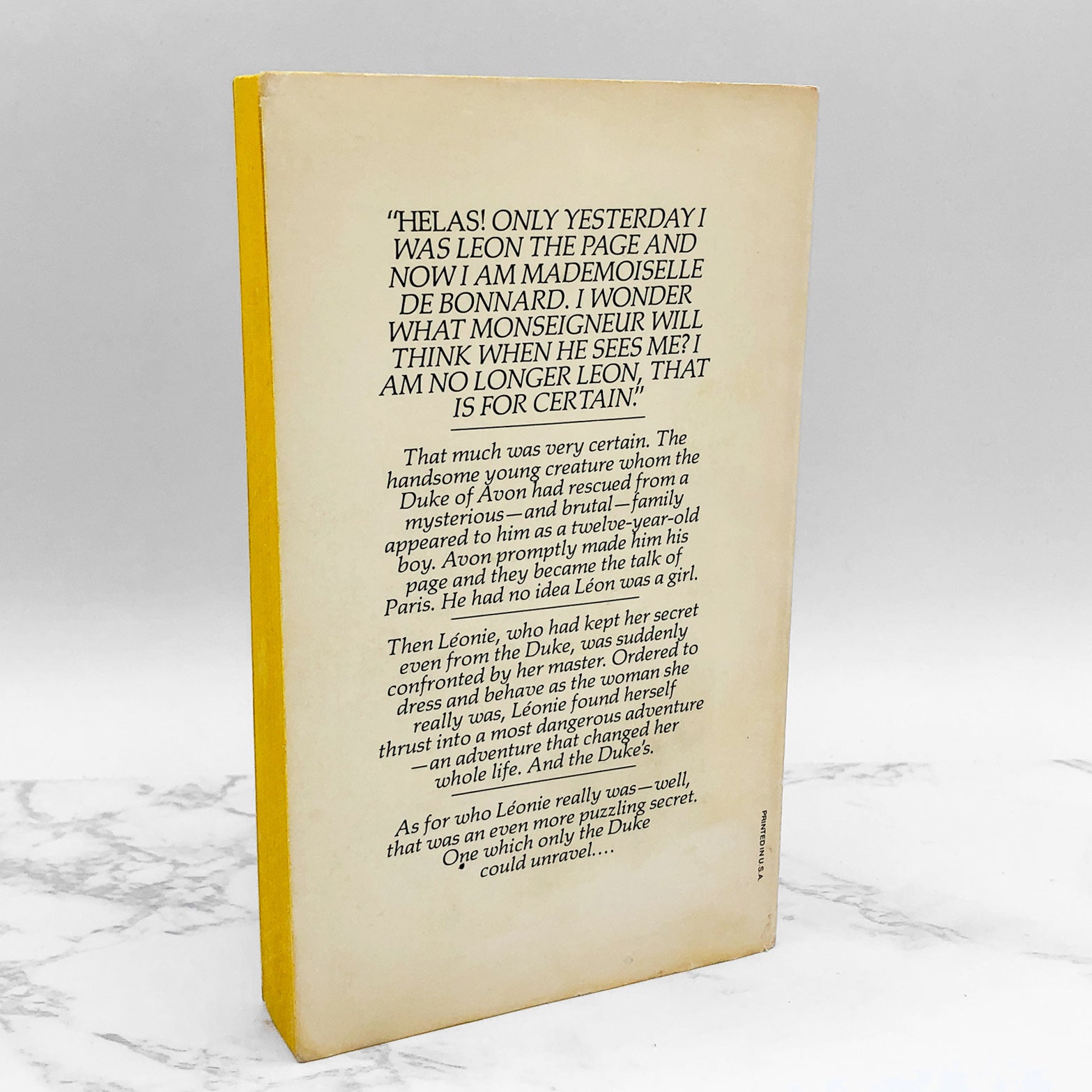 Lord Justin Alastair, the notorious Duke of Avon, known for his coldness of manner, his remarkable omniscience, and his debauched lifestyle. Society believes the worst of Justin, who is clearly proud of his sobriquet, 'Satanas'. In a dark Parisian back alley, he is accosted by Leon, a young person dressed in ragged clothing running away from a brutal rustic guardian. The Duke buys Leon, a redheaded urchin with strangely familiar looks...